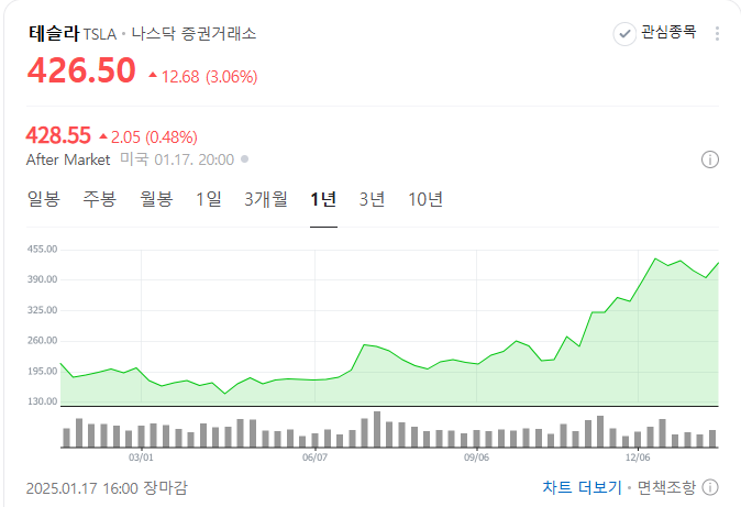 테슬라는 현재 전기차 시장의 선두주자로 확고히 자리매김하고 있으며, 자율주행 기술, 배터리 혁신, 에너지 솔루션 등 다양한 분야에서 활발한 활동을 펼치고 있습니다. 2025년 1월 17일 기준 테슬라의 주가는 426.50달러로, 최근 몇 년간의 눈부신 성장세를 반영하고 있습니다.