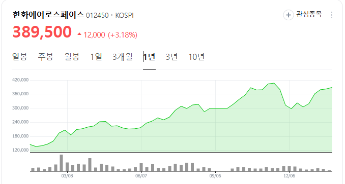 한화에어로스페이스의 주가는 최근 52주 최고가 416,000원, 최저가 135,000원으로 변동하고 있으며, 외국인 지분율은 44.8%에 달한다. 주주 구성은 한화가 34.0%, 국민연금공단이 7.6%, 자사주가 0.1%를 차지하고 있다.